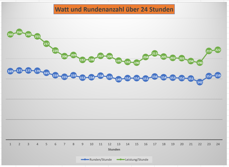 Durch Christophs Leistungsabfall in der zweiten Hälfte der Fahrt wurde eines offensichtlich: Auf der Bahn ist Aerodynamik wichtiger als die Wattleistung. Richtete er sich auf um den Magen und den Rücken zu entlasten, konnte er deutlich höhere Wattwerte treten und wurde trotzdem langsamer. In der Aeroposition war er trotz geringerem Druck am Pedal schneller.